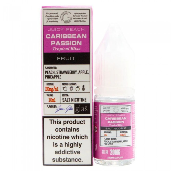 Caribbean Passion 10ml Nic salt by Glas Basix is a full of fruit blend that compliments itself perfectly. Full of soft white peach, sweet strawberries, crisp apple, and a touch of pineapple.