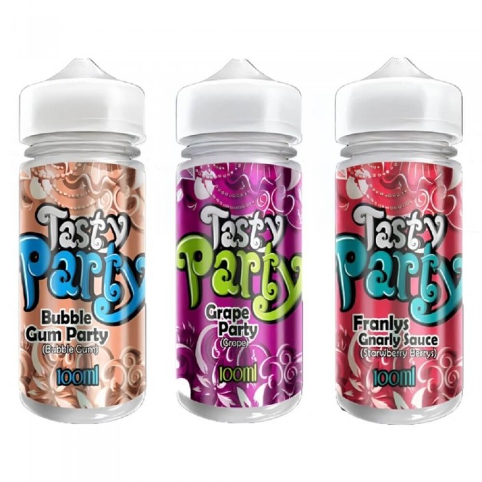 Tasty Party Shortfill E-Liquid 100ml. Available flavours are Grapple & Slapcurrant, Pink Grenade, Cherry Cola, Blazing, Apple Currant, Vamps, Blue Slushy, Icy Menthol, Tobacco, Red Slushy, Lemon Tart, Vanilla Delight, Blackcurrant Party, Rainbow Lollipop Party, Mango Party, Hzn Burg, Bubble Gum Party, Grape Party, Pineapple Party, Lemonade Party, Kanzi, Raspberry Sherbet, Franlys Gnarly Sauce.